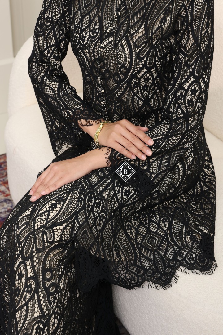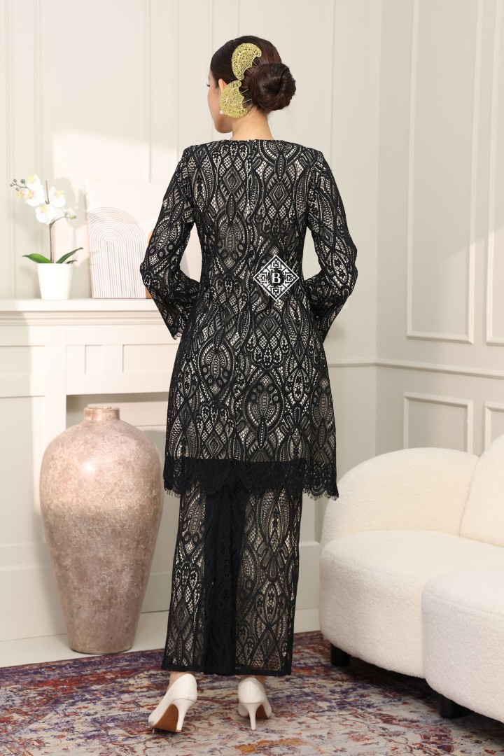 • Perincian Halus: Butang kain klasik dan kemasan tepian scallop lace pada hujung baju dan lengan menonjolkan kualiti jahitan butik.