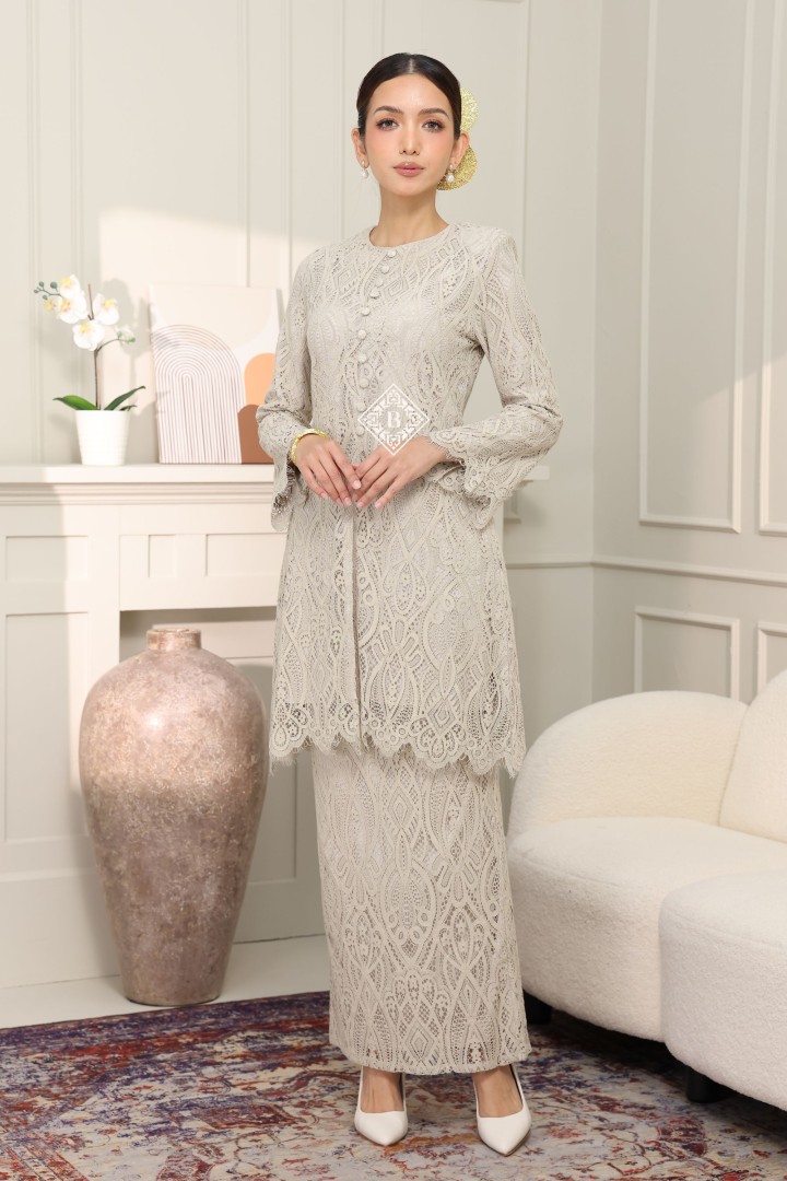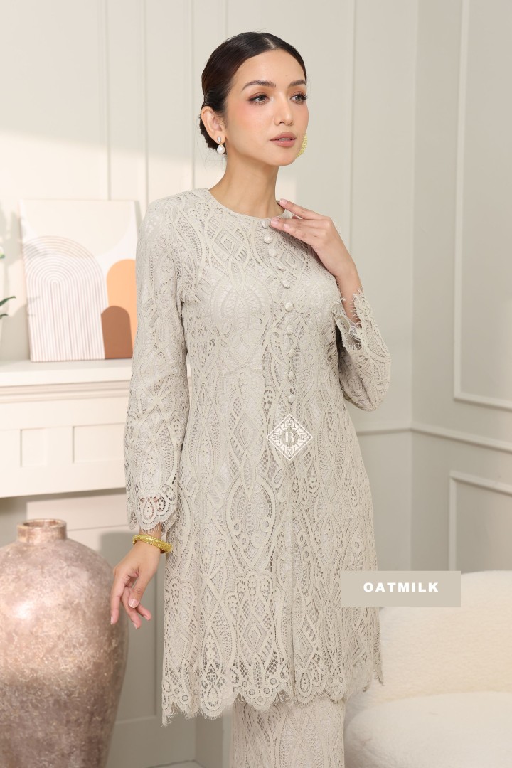• Perincian Halus: Butang kain klasik dan kemasan tepian scallop lace pada hujung baju dan lengan menonjolkan kualiti jahitan butik.