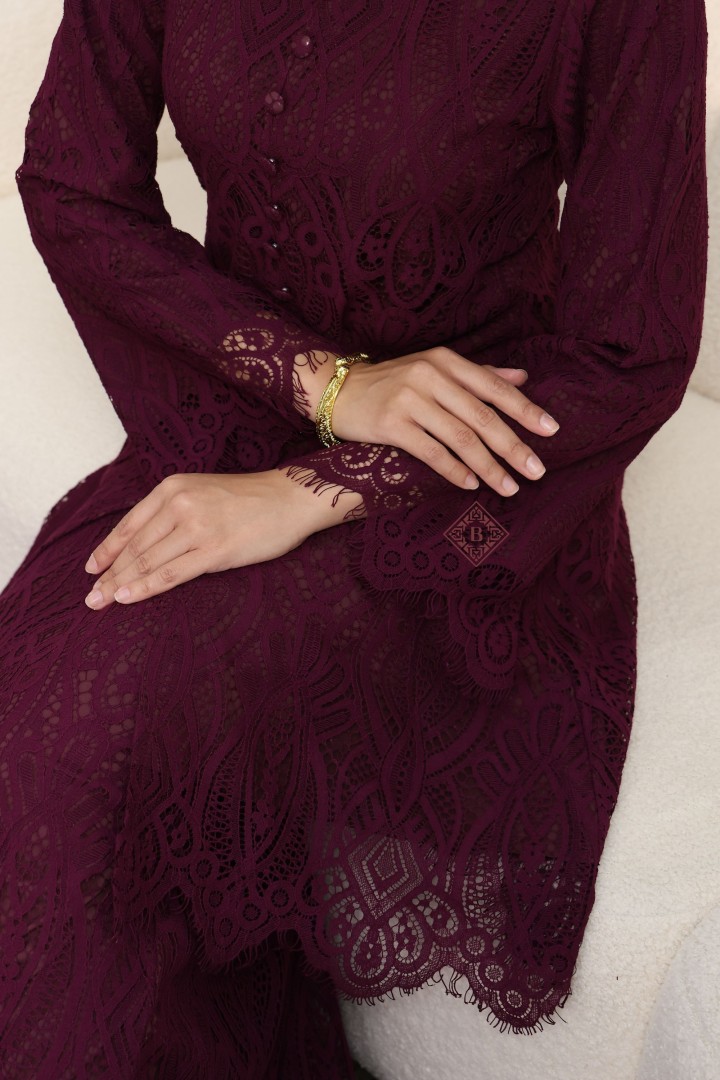 • Rekaan Lengan: Rekaan lengan panjang sedikit kembang di hujung (bell sleeves) menambah sentuhan feminin dan dramatik, dihiasi kemasan scallop lace yang menawan.