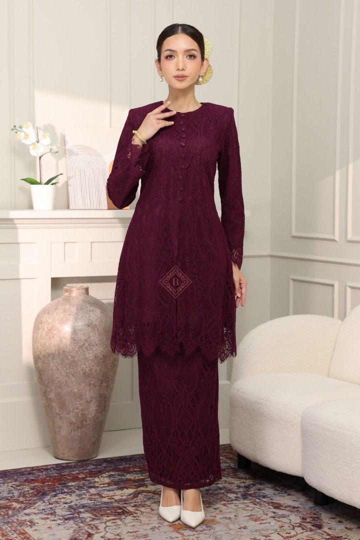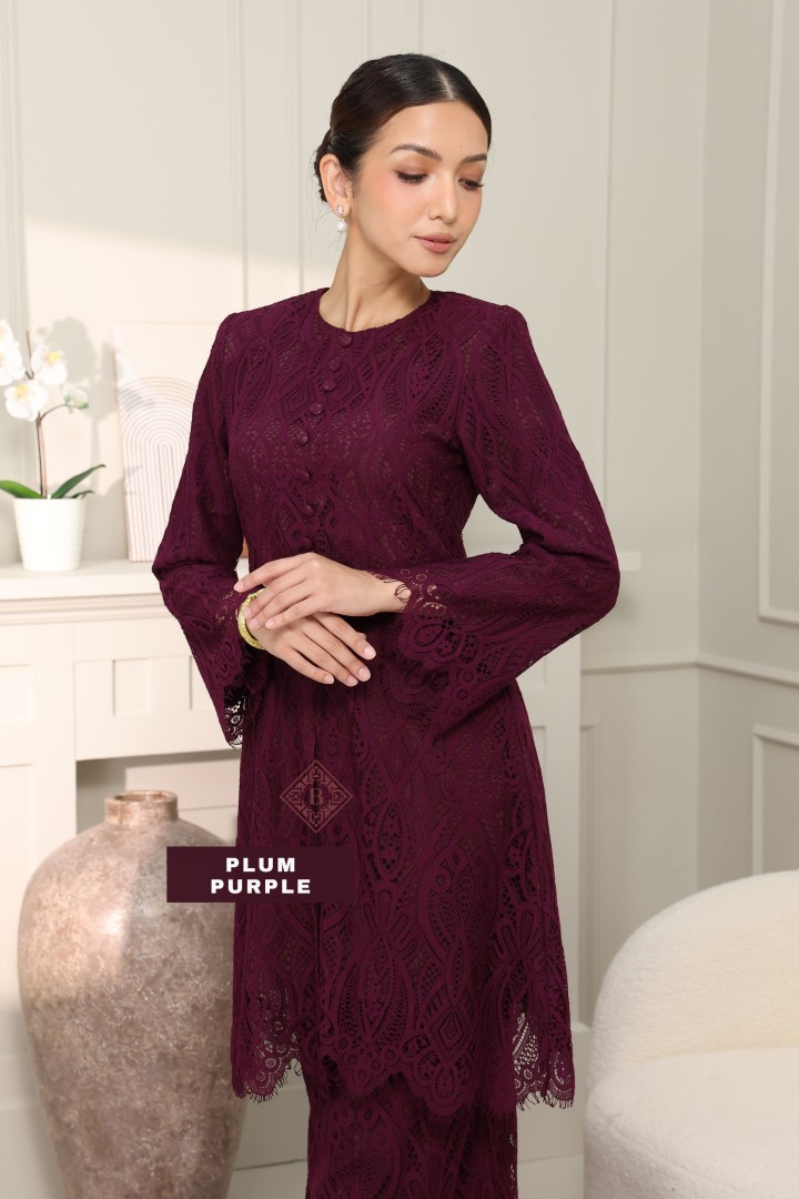 • Perincian Halus: Butang kain klasik dan kemasan tepian scallop lace pada hujung baju dan lengan menonjolkan kualiti jahitan butik.