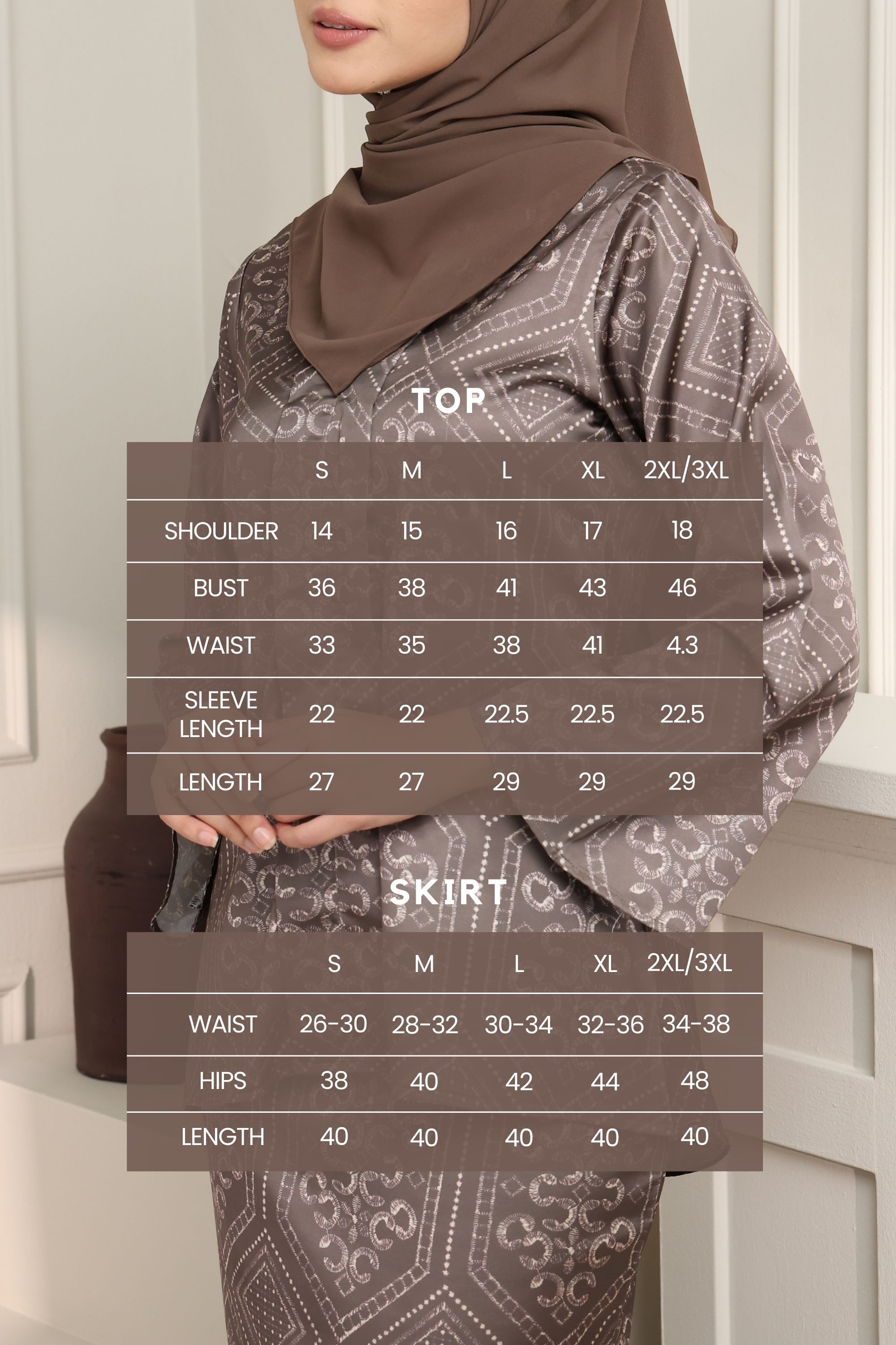 Redefine elegance with this exquisite Kebaya in a timeless taupe hue. Crafted from premium satin, it radiates a soft sheen that enhances its luxurious feel, while the intricate geometric motifs add a touch of cultural sophistication.