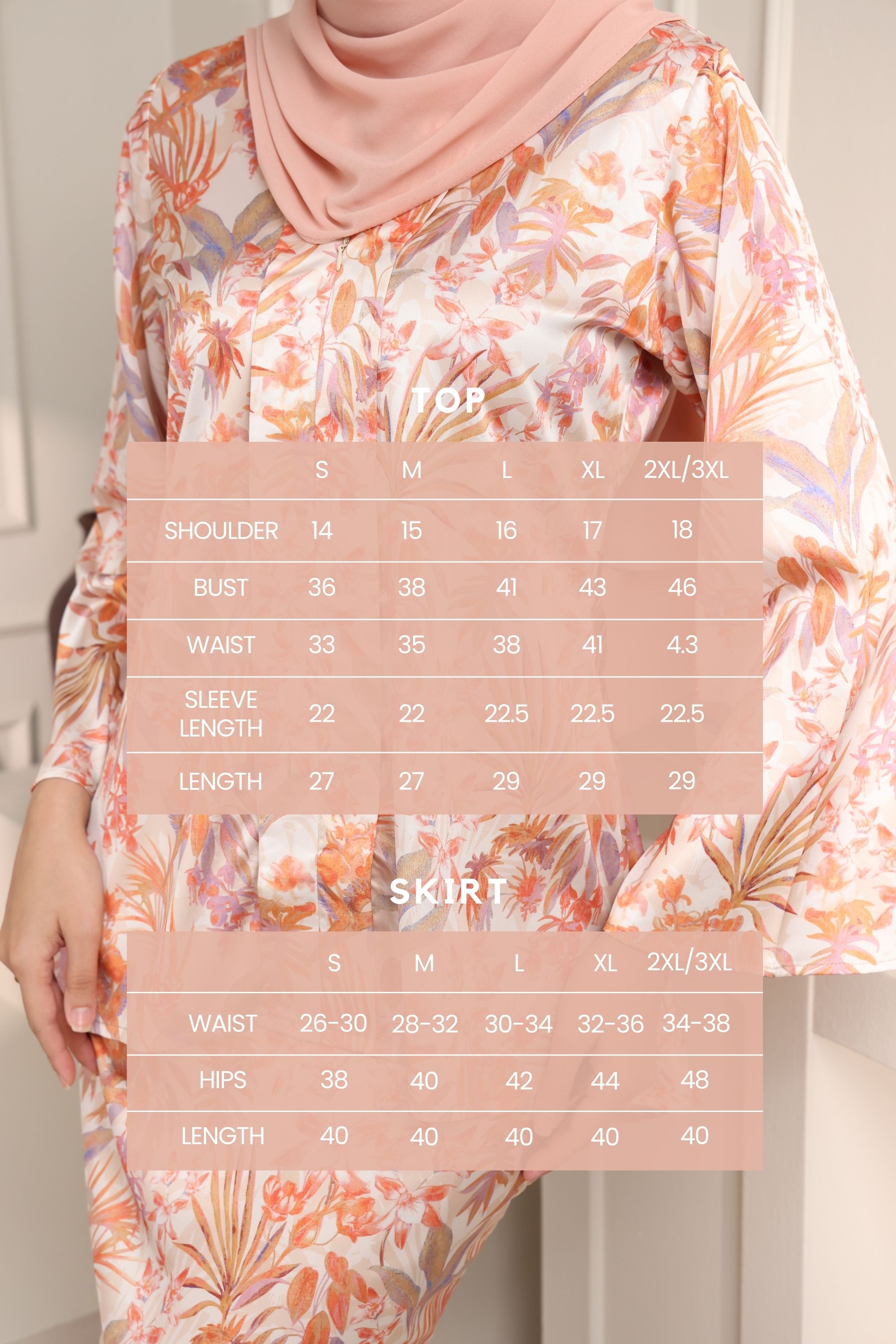 Bring a touch of vibrance and elegance to your wardrobe with our Warm Floral Kebaya, crafted from premium satin for a sleek and polished look. Designed with a soft cream base adorned with floral and leaf motifs in peach, orange, and lilac tones, this set radiates warmth and femininity.