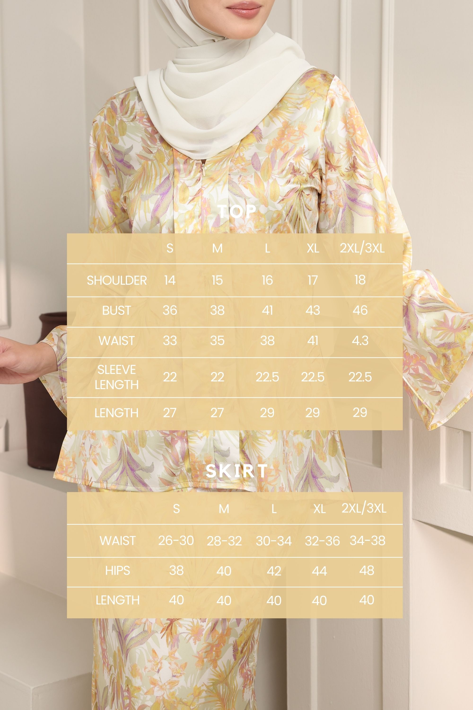Radiate elegance and freshness with our Pastel Floral Kebaya, designed to bring a touch of softness and femininity to your wardrobe. Crafted from premium satin, this ensemble features delicate pastel florals in shades of yellow, lilac, and green over a cream base, creating a refreshing and graceful look.