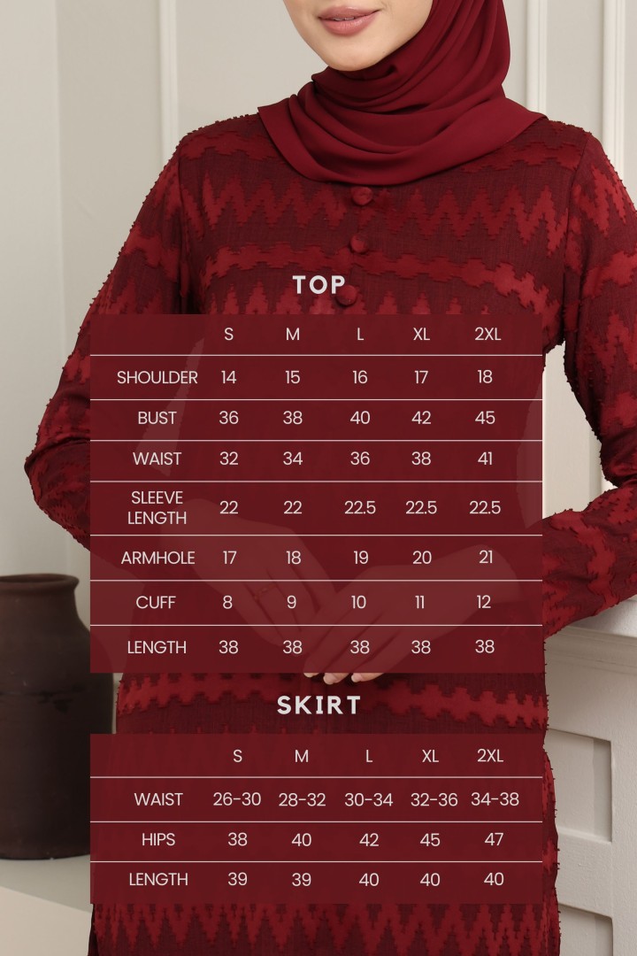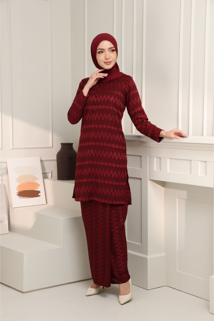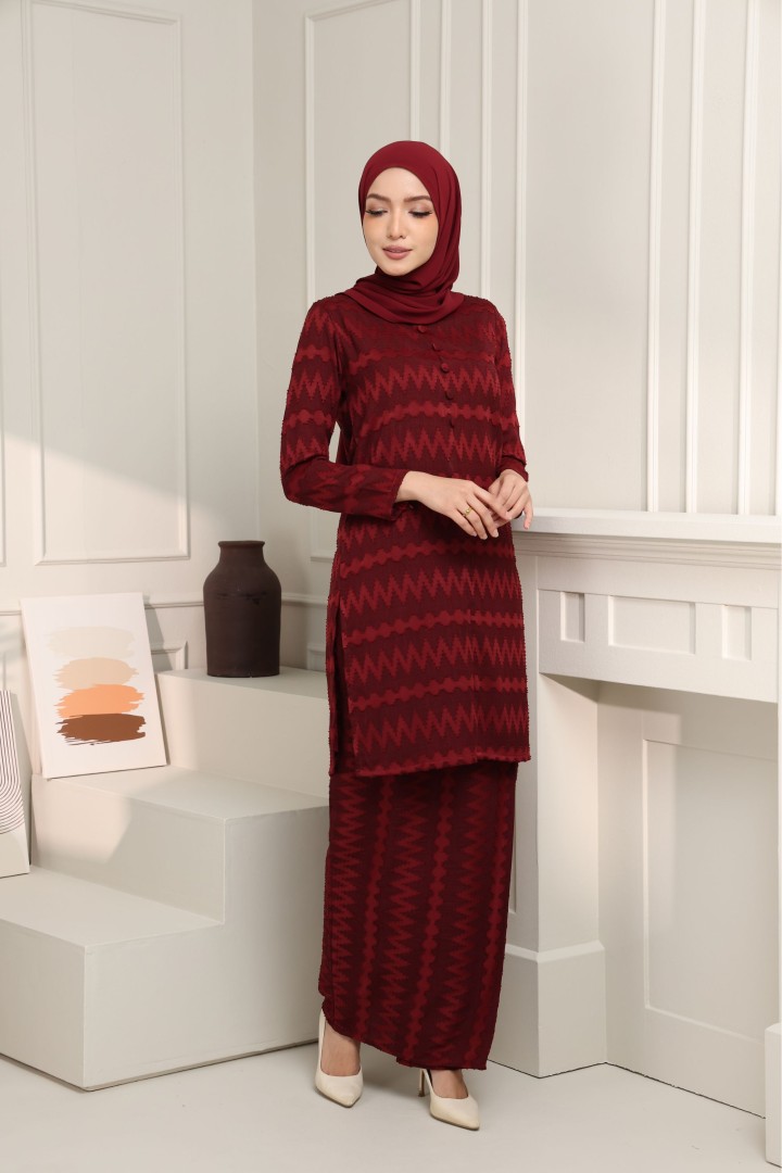 Elegantly simple yet effortlessly stylish — this baju kurung set exudes timeless sophistication. Crafted from a textured jacquard fabric with a subtle zigzag pattern, it offers both comfort and class in every detail. The top features a straight-cut silhouette with fabric-covered buttons down the front, complemented by matching lipat batik skirt for an easy, graceful fit. Perfect for formal occasions or everyday elegance, this piece captures the essence of modern traditional wear with a refined touch.