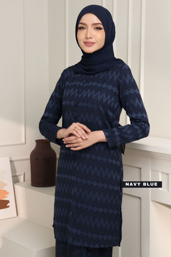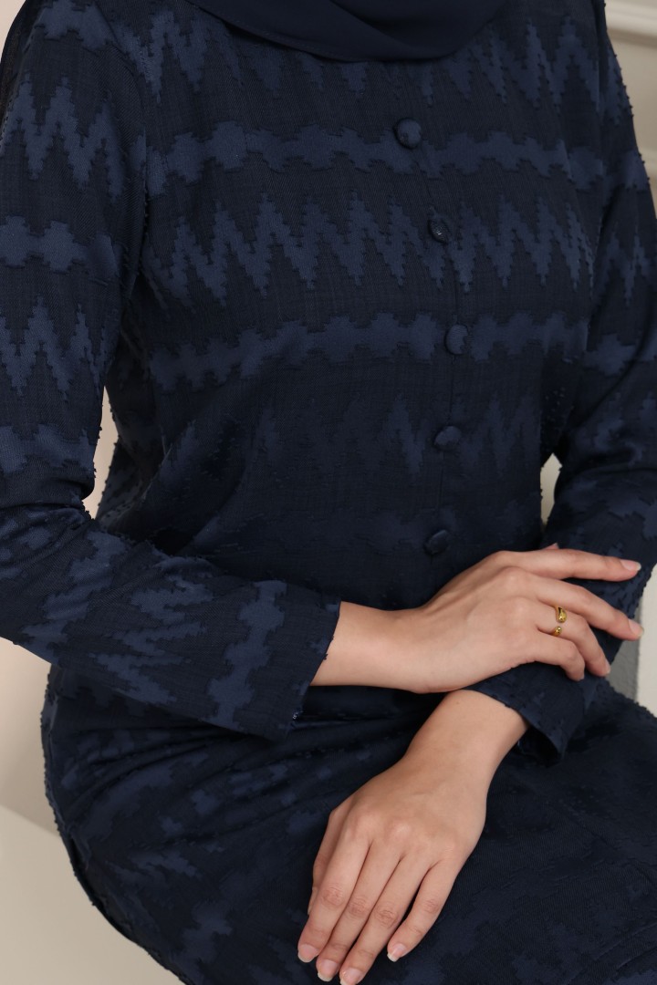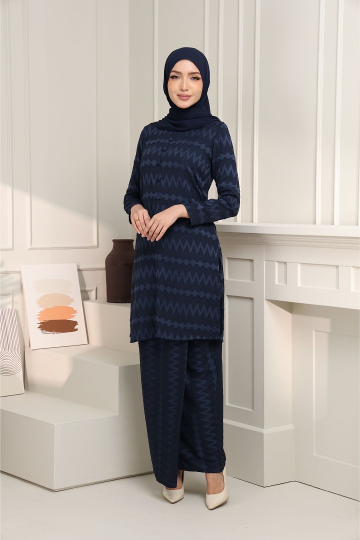 Elegantly simple yet effortlessly stylish — this baju kurung set exudes timeless sophistication. Crafted from a textured jacquard fabric with a subtle zigzag pattern, it offers both comfort and class in every detail. The top features a straight-cut silhouette with fabric-covered buttons down the front, complemented by matching lipat batik skirt for an easy, graceful fit. Perfect for formal occasions or everyday elegance, this piece captures the essence of modern traditional wear with a refined touch.