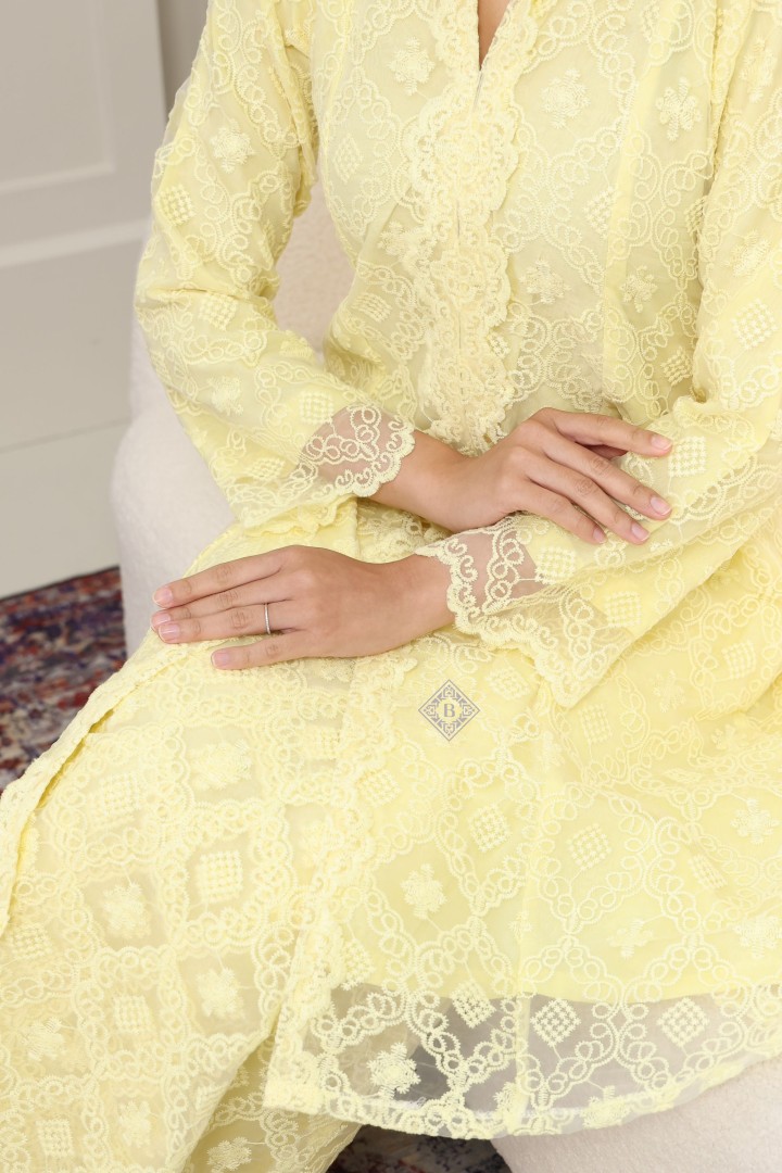This collection is crafted from embroidered organza featuring geometric diamond pattern that provides texture, depth, and a visually aesthetic.