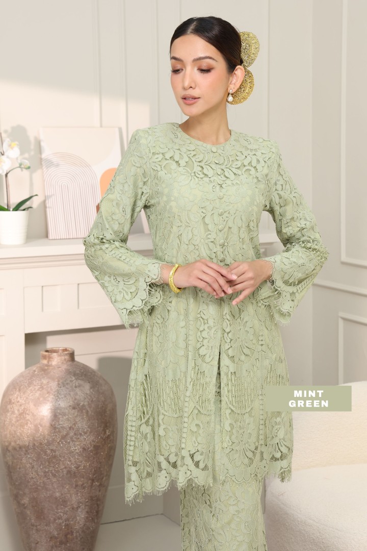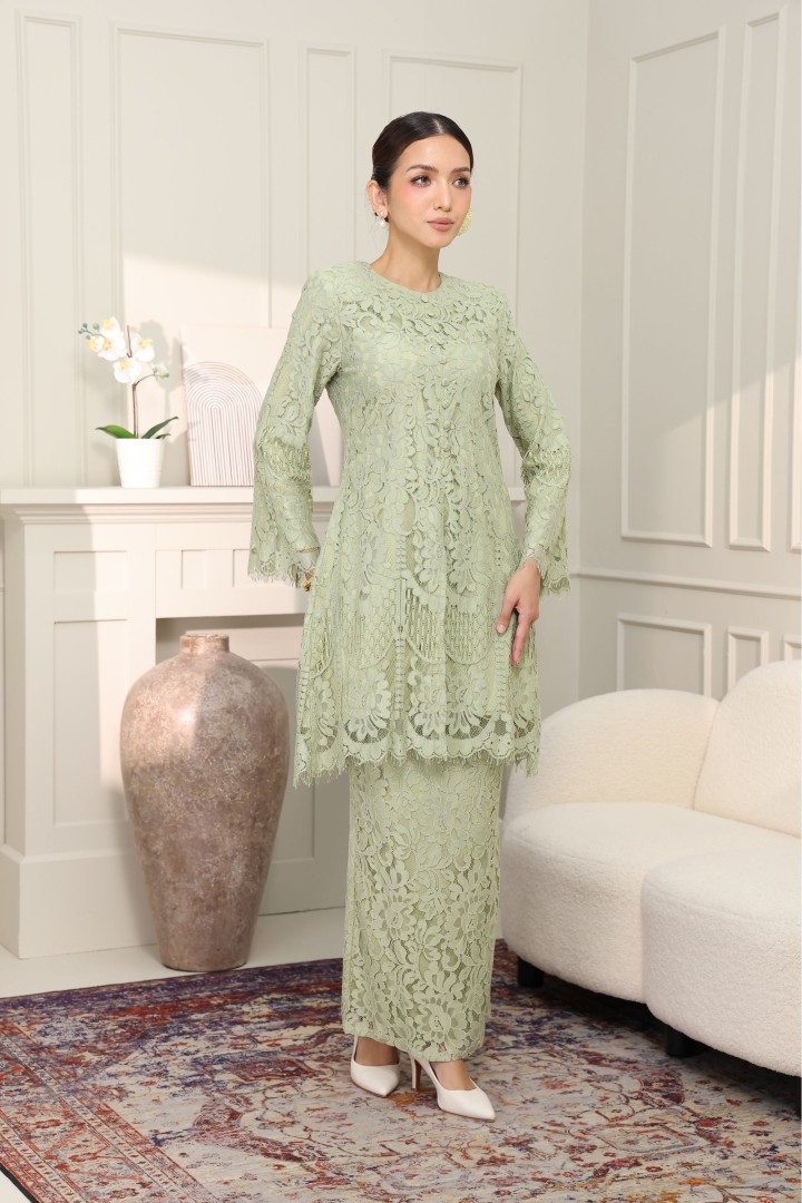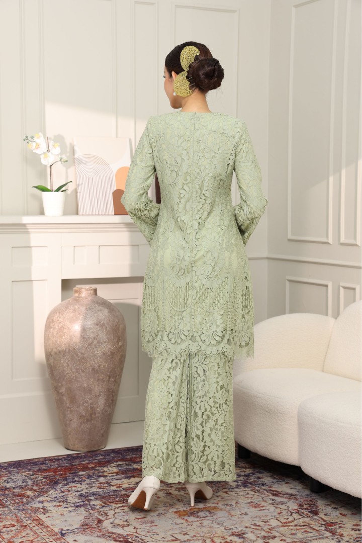 • Rekaan Lengan: Rekaan lengan panjang sedikit kembang di hujung (bell sleeves) menambah sentuhan feminin dan dramatik, dihiasi kemasan scallop lace yang menawan.