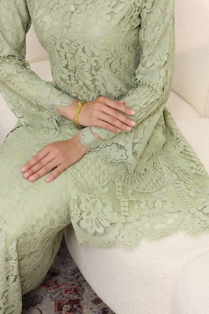 • Perincian Halus: Butang kain klasik dan kemasan tepian scallop lace pada hujung baju dan lengan menonjolkan kualiti jahitan butik.