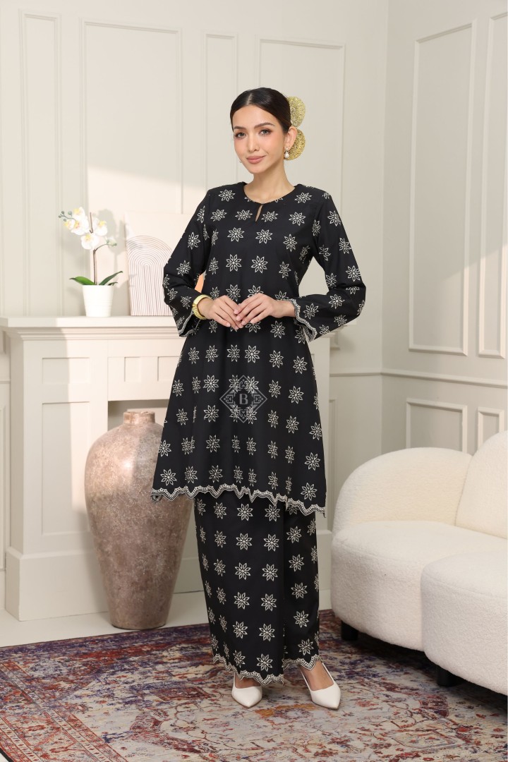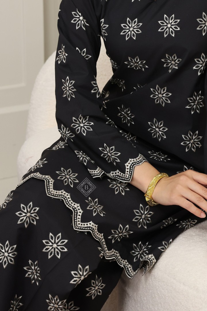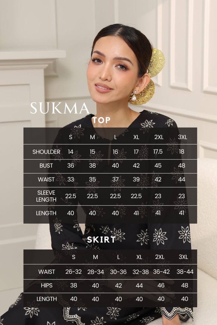 Step into understated elegance with our SUKMA Kurung Riau, a contemporary masterpiece inspired by timeless tradition. SUKMA featuring a refined silhouette that offers graceful coverage. It is adorned from neckline to hem with delicate, all-over gold thread embroidery, forming subtle, stylized floral or starburst motifs. The design is anchored by a meticulously detailed embroidered panel at the chest, adding depth and focus. The hemline finishes beautifully with a scalloped edge, intricately bordered with matching embroidery for a polished, high-end look.