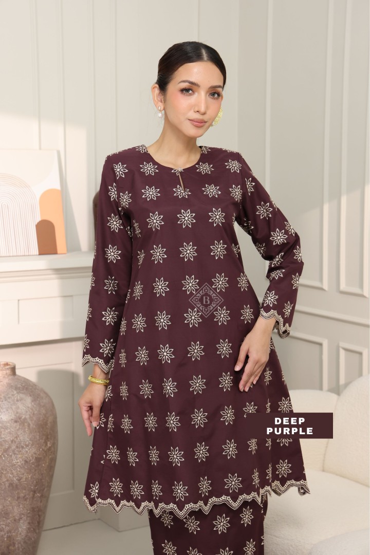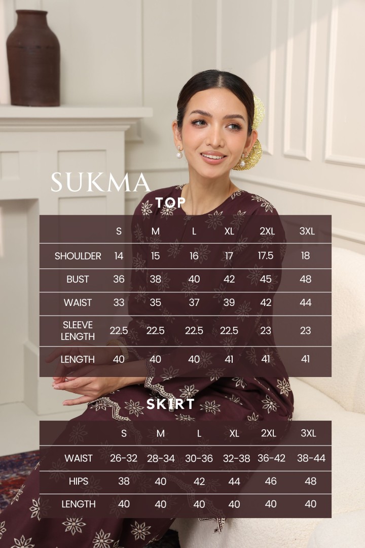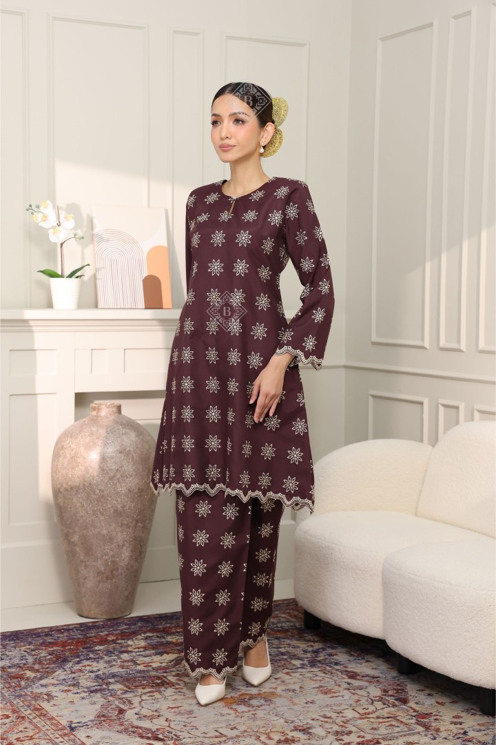 Step into understated elegance with our SUKMA Kurung Riau, a contemporary masterpiece inspired by timeless tradition. SUKMA featuring a refined silhouette that offers graceful coverage. It is adorned from neckline to hem with delicate, all-over gold thread embroidery, forming subtle, stylized floral or starburst motifs. The design is anchored by a meticulously detailed embroidered panel at the chest, adding depth and focus. The hemline finishes beautifully with a scalloped edge, intricately bordered with matching embroidery for a polished, high-end look.