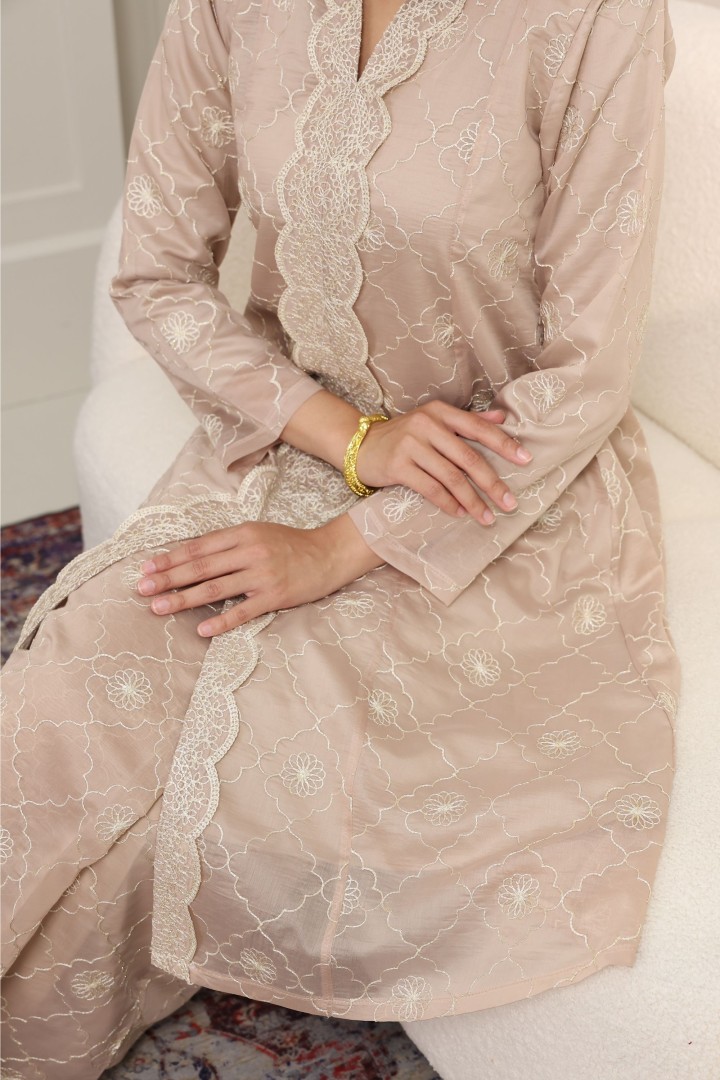 Designed with a modest V-neckline and a classic silhouette, it offers effortless grace and comfort for any occasion. The intricate detailing of metallic threads makes this piece a perfect choice for festive celebrations or refined everyday wear.