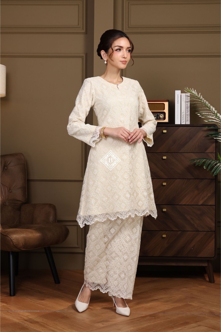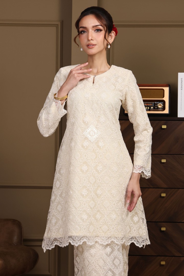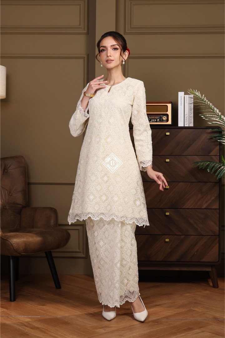 Each piece is a celebration of classic Malay sophistication, featuring a beautifully tailored silhouette, the signature loose fit of the Kurung Riau, and delicate lace or embroidered detailing that speaks of heritage and craftsmanship.